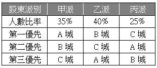 2. 公司股東支持新廠設廠位置的人數比率與偏好如下表,請回答下列問題(未列出計算說明過程不計分)。(一)若以多數決方式擇一,則新廠會設於何城?(二)若考慮股東們的選擇順序,以兩輪投票,則A城與B城先投票;勝出者再與C城投票,則新廠會設於何城?(三)若以權值考慮股東的選擇順序:第一優先權值為3,第二優先權值為2,第3優先權值為1,則新廠會設於何城? (109年考題)
