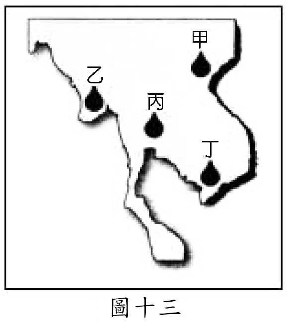 24. 圖十三,甲乙丙丁四處為中南半島上各國的首都,請問何者在2011年底的洪災最嚴重?