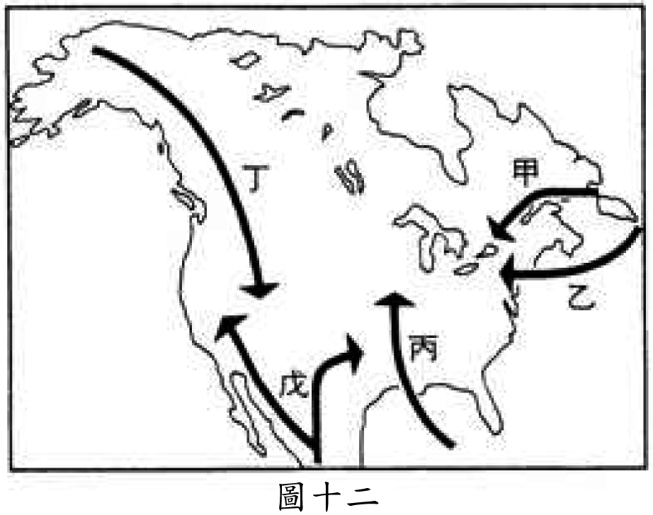 20. 圖十二為早期移民北美的路徑分布圖,圖中代表分別是各民族的移民路線,正確是: