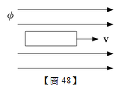48. 如【圖48】所示電路,導體長10公尺,在磁通密度為0.5韋伯/平方公尺之磁場中,以每秒10公尺速度順著磁場的移動方向移動,則其生成之感應電動勢應為多少伏特?