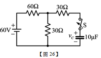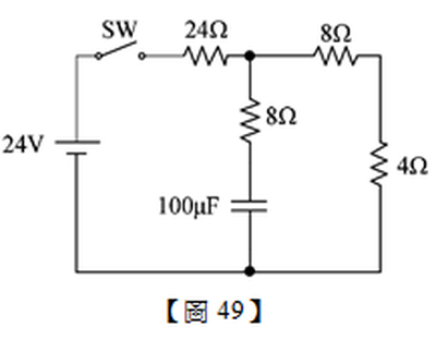49. 如【圖49】所示電路,假設電容器無任何儲能,試問開關SW閉合之後,電容器至少需要花多少時間才會達到穩態?