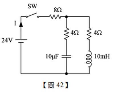 42. 如【圖42】所示電路,假設開關SW未閉合前,電容器與電感器皆無儲存能量,則開關SW閉合瞬間,其總電流I為多少安培?