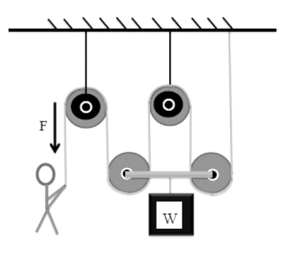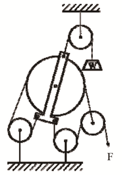 38. 有一起重滑車裝置,如圖所示;若以繩索連接各輪及於下方吊掛重物W=5600公斤,機械效率80%,試求需施力F為多少?