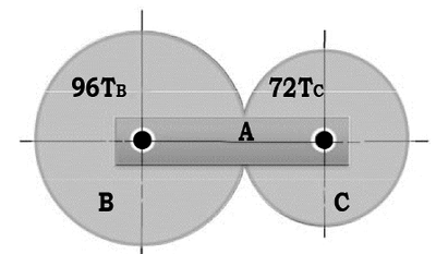 )為72齒,若齒輪B固定不轉,A旋臂每分鐘順時針方向轉一圈,試求C齒輪之轉數為何?