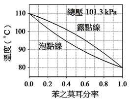 33. 一連續式蒸餾塔每小時進料100莫耳之苯-甲苯混合溶液(苯為40莫耳,甲苯為60莫耳),假設塔內各板皆為理想板,塔頂出料之飽和蒸氣溫度為83.5˚C,壓力為101.3 kPa(溫度-莫耳分率組成圖如圖所示),塔底產物含甲苯90 mol %,則下列何者正確?