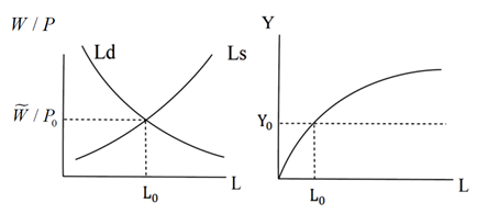 4. 下列兩圖分別為某一個國家的勞動市場均衡及生產函數,其中W/P為實質工資率,Ls為勞動供給,Ld為勞動需求,Y為產出,L為勞動僱用量。假設此國的名目工資率不能低於,但可高於以維持市場均衡。且當物價水準為P0時,勞動供給量等於勞動需求量。請回答下列問題:(未說明原因或未繪圖,不計分)(一)請由上面兩個圖形,說明並繪出該國總合供給(AS)曲線的形狀。(二)下列的敘述,對、錯誤或不一定?請說明你的理由。「需求法則是造成一國物價水準與總合需求量呈負向關係的原因。」(三)假設該國原本處於充分就業且實質工資率為。現因新型冠狀病毒(COVID-19)出現,造成該國自發性消費下降。請運用總合供給與需求模型,繪圖說明新型冠狀病毒的出現對該國產出、物價水準、勞動僱用量、名目工資率及實質工資率的影響。