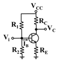 46. 如圖所示矽質電晶體電路,若β=100,RC=2 KΩ,R1=10 KΩ,R2=15KΩ,VCC=15 V,VC=5 V時,試求其IB為何?