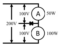 36. 直流單相三線配電線路供應A、B兩燈泡用電,其接線、額定電壓及額定功率如圖所示,當中性線斷線時(圖中×位置),下列敘述何者正確?