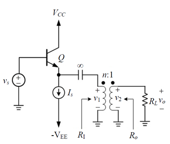 36. 如圖變壓器交連電晶體放大器,若電晶體Q的電流增益為β=100,Is=10mA,熱電壓(thermal voltage)V