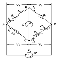 1. 如下圖為Hay電橋(Hay’s Bridge),其中C4為標準可變電容,R4為可變電阻,R2及R3為固定電阻。L1及R1分別為待測未知電感和其內電阻。Vs為AC電源,角頻率為ω。當電橋平衡時,試回答下列問題:(一)求電感L1=? (二)求電感L1的內電阻R1=? (三)求電感L1的品質因數Q值。