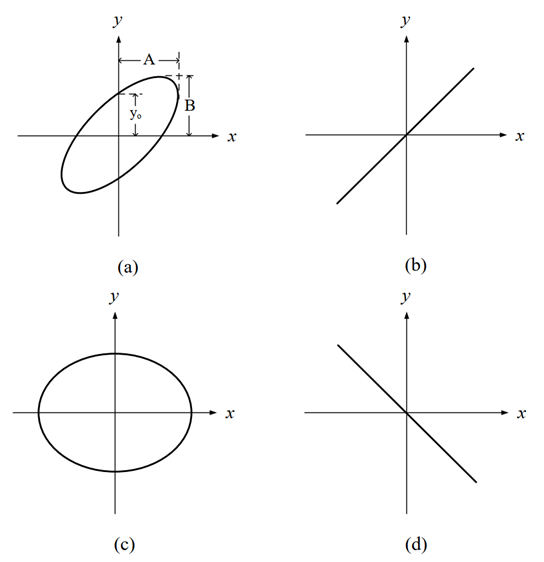 2. 已知兩信號x=Acosωt及y=Bcos(ωt+θ),其相角差為θ,分別輸入到示波器的水平和垂直的輸入端,利用理查瑟式圖(Lissajous diagram)方法(波形圖示的定義如圖(a)所示,其中sin θ ≡ yo/B),分別分析判斷示波器所顯示的下列四種狀態,分別表示兩信號x和y之間的相角差θ各為多少? (一)圖(a)中,兩信號x和y之間的相角差θ=?(二)圖(b)中,兩信號x和y之間的相角差θ=?(三)圖(c)中,兩信號x和y之間的相角差θ=?(四)圖(d)中,兩信號x和y之間的相角差θ=?
