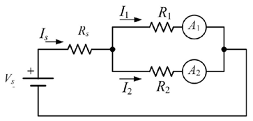 3. 下圖中,已知Rs=7.5Ω,R1=18Ω,R2=6Ω及Vs=240V;若安培計A1的誤差為2%,安培計A2的誤差為1%,試求:(以下問題均需考慮誤差範圍)(一)由安培計A1量測到的電流是多少安培(A)?(二)由安培計A2量測到的電流是多少安培(A)?(三)由電源端觀察到的電流Is為多少安培(A)?(四)計算電源Vs所提供的功率Ps是多少瓦(W)?