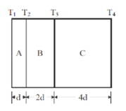 2. 如下圖所示,有三層平板材料,各個表面溫度分別為T1=200℃、T2=160℃、T3=140℃、T4=60℃,若達熱傳恆穩狀態,請問各層平板材料的熱傳導係數之比值(kA:kB:kC)為__________。(請填整數比值) (110年度考題)